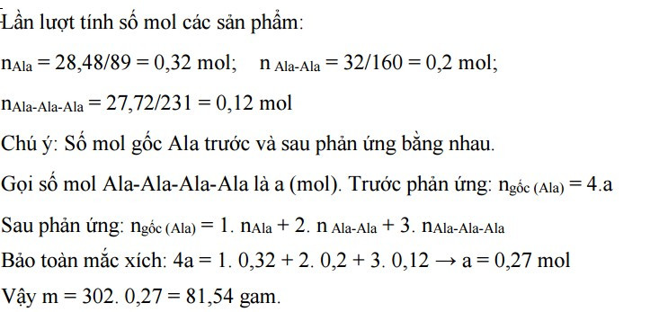 Câu 1: Thủy phân hết m gam tetrapeptit Ala-Ala-Ala Ala (mạch hở) thu được hỗn hợp gồm 28,48 gam Ala, 32 gam Ala-Ala và 27,72 gam Ala-Ala-Ala.