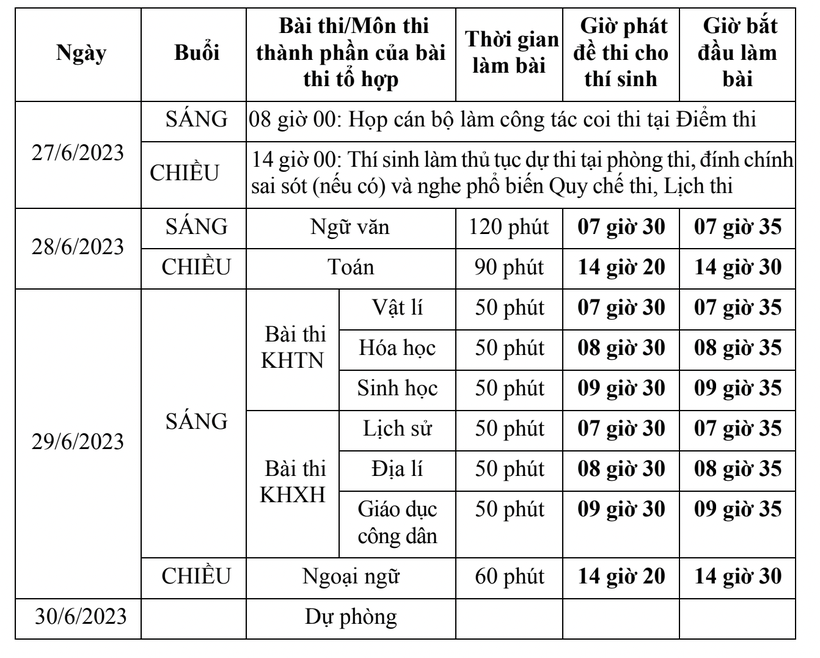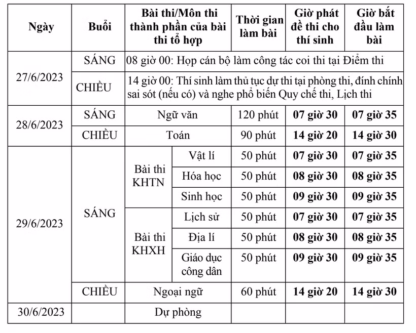 Được tổ chức trong các ngày 27, 28,29 và 30/6, Kỳ thi tốt nghiệp THPT năm 2023 tổ chức thi 5 bài thi, gồm: 3 bài thi độc lập là Toán, Ngữ văn, Ngoại ngữ; 1 bài thi tổ hợp Khoa học Tự nhiên gồm các môn thi thành phần Vật lí, Hóa học, Sinh học; 1 bài thi tổ hợp Khoa học Xã hội gồm các môn thi thành phần Lịch sử, Địa lí, Giáo dục công dân đối với thí sinh học chương trình giáo dục phổ thông cấp THPT hoặc các môn thi thành phần Lịch sử, Địa lí đối với thí sinh học chương trình GDTX cấp THPT.