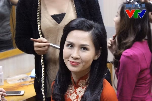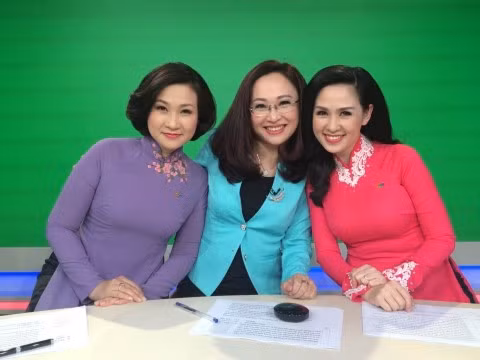 BTV Thúy Hằng chụp ảnh cùng đồng nghiệp sau khi dẫn bản tin Thời sự VTV.