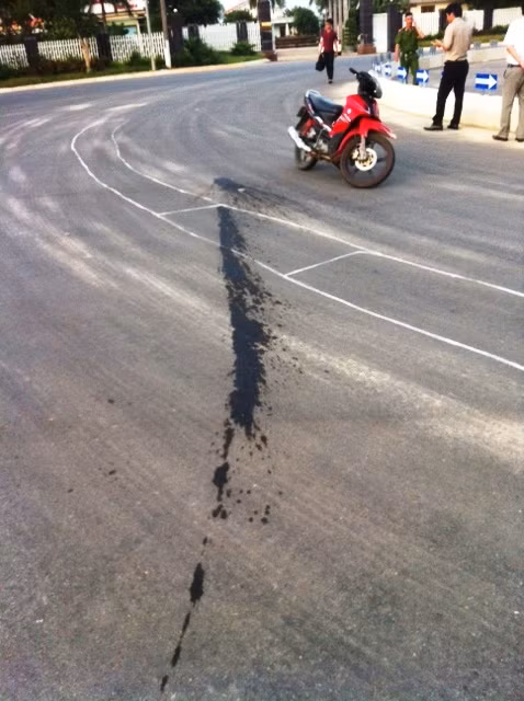 Chất lạ có mùi hắc và tạo vệt đen trên mặt đường nhựa tại vị trí ngã ba này đã được phía Cty chuyển đến công an huyện Bố Trạch để điều tra.