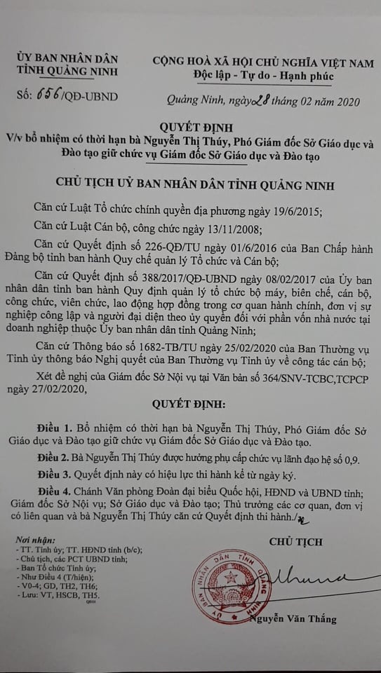 Ngày 28/2, Chủ tịch UBND tỉnh Quảng Ninh Nguyễn Văn Thắng đã ký Quyết định số 656/QĐ-UBND về việc bổ nhiệm có thời hạn bà Nguyễn Thị Thúy, Phó Giám đốc Sở GD&ĐT giữ chức Giám đốc Sở GD&ĐT.