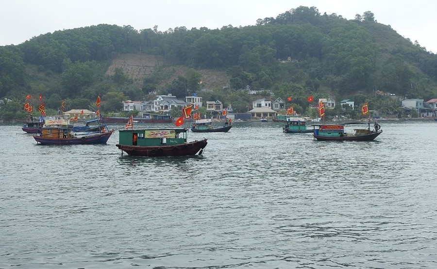 | Song song với đoàn rước trên bờ là đoàn rước dưới biển của những tàu ngư dân. |