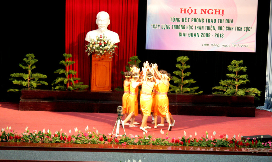 7.30: Chương trình văn nghệ chào mừng Hội nghị do thầy cô giáo và các em học sinh TP Đà Lạt biểu diễn. Đây chính là những sản phẩm từ phong trào thi đua "Trường học thân thiện - Học sinh tích cực" tại tỉnh Lâm Đồng.