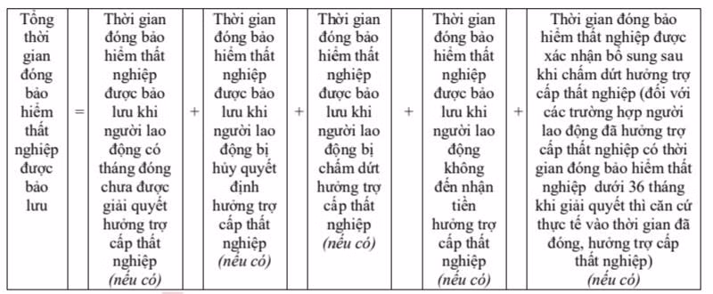 Số tháng đóng bảo hiểm thất nghiệp được xác nhận bổ sung để bảo lưu = Số tháng đóng bảo hiểm thất nghiệp đã xét hưởng trợ cấp thất nghiệp + Số tháng đóng bảo hiểm thất nghiệp xác nhận bổ sung - Số tháng đóng bảo hiểm thất nghiệp tương ứng với số tháng đã nhận tiền trợ cấp thất nghiệp - Số tháng đóng bảo hiểm thất nghiệp tương ứng số tháng bị tạm dừng hưởng trợ cấp thất nghiệp.