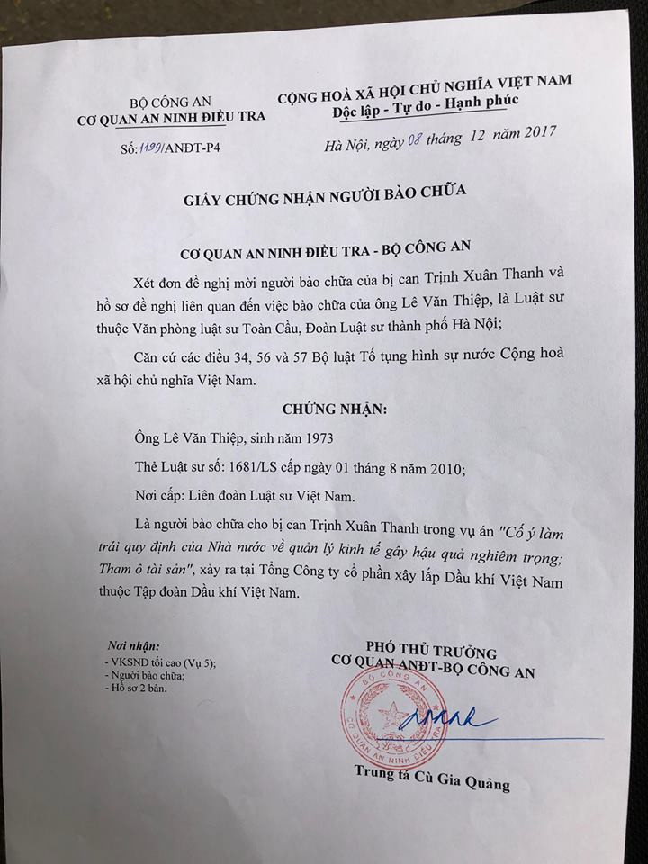 Ngoài luật sư Lê Văn Thiệp, trước đó, 2 luật sư khác thuộc thuộc Đoàn luật sư Hà Nội đã được cấp giấy chứng nhận trong giai đoạn hỏi cung.