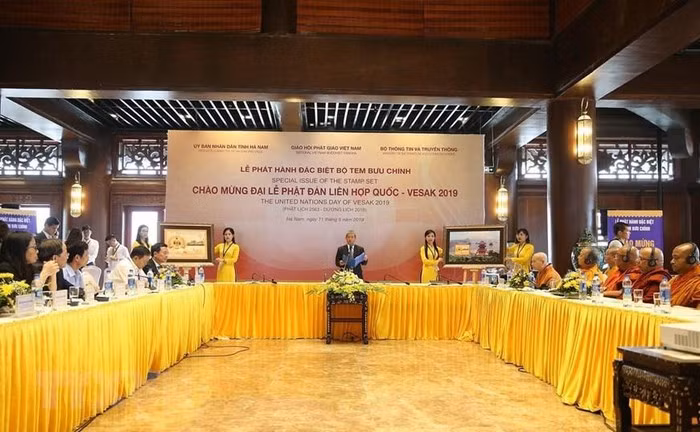 Quang cảnh Lễ phát hành đặc biệt Bộ tem bưu chính chào mừng Đại lễ Vesak 2019. (Ảnh: TTXVN)