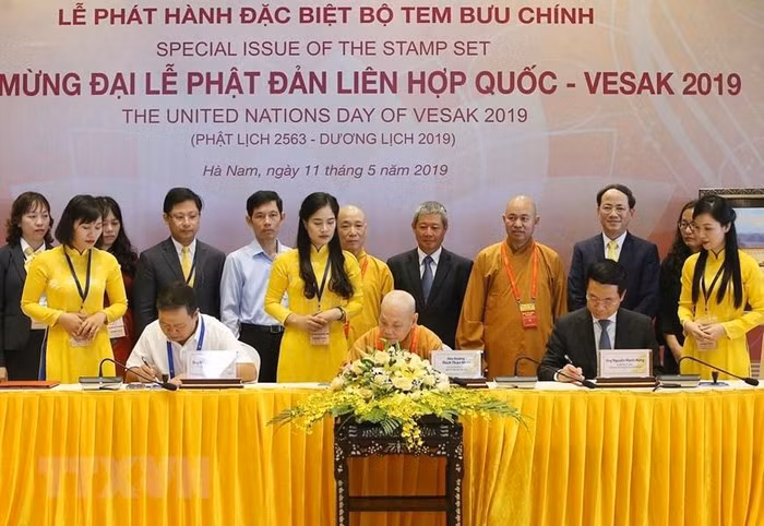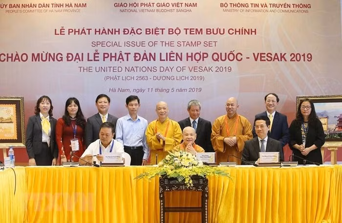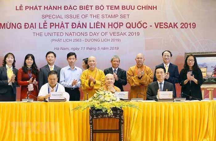 Hòa thượng Thích Thiện Nhơn (giữa), Chủ tịch Hội đồng Trị sự Trung ương Giáo hội Phật giáo Việt Nam, Chủ tịch Ủy ban Tổ chức quốc gia Đại lễ Phật đản Liên hợp quốc-Vesak 2019, Bộ trưởng Bộ Thông tin và Truyền thông Nguyễn Mạnh Hùng (bên phải) và Phó Bí thư Tỉnh ủy, Chủ tịch UBND tỉnh Hà Nam Nguyễn Xuân Đông ký phát hành đặc biệt Bộ tem bưu chính chào mừng Đại lễ Vesak 2019. (Ảnh: Dương Giang/TTXVN)