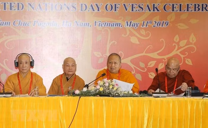 Hòa thượng, giáo sư-tiến sỹ Phra Brahmapundit (thứ ba từ phải sang), Chủ tịch sáng lập Ủy ban Tổ chức quốc tế Đại lễ Phật đản Liên hợp quốc phát biểu. (Ảnh: Dương Giang - TTXVN)