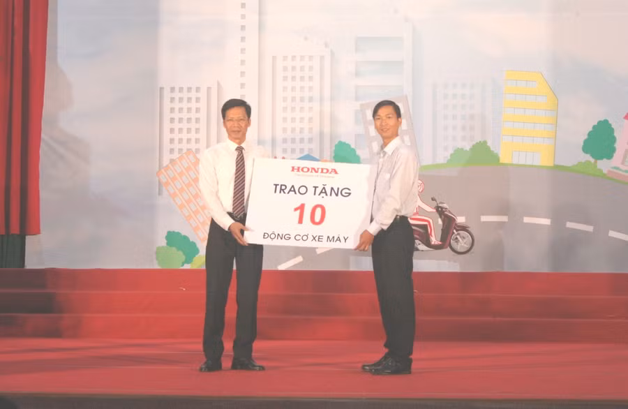 Công ty Honda Việt Nam trao 500 mũ bảo hiểm đạt chuẩn cho SV và 10 mô hình động cơ xe máy Honda. Công ty Cổ phần xe điện toàn cầu Pega tặng 250 mũ bảo hiểm cho HS.