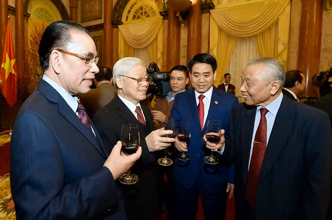 | Tổng Bí Thư Nguyễn Phú Trọng, nguyên Tổng Bí thư Nông Đức Mạnh, Thủ tướng Nguyễn Xuân Phúc và Chủ tịch Quốc hội Nguyễn Thị Kim Ngân tại buổi gặp mặt. Ảnh: VGP |