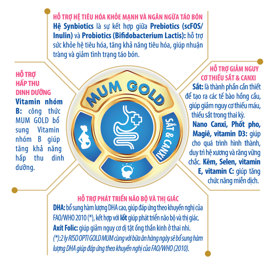 (*): uống 2 ly RISO OPTI GOLD MUM cùng với bữa ăn hàng ngày sẽ bổ sung hàm lượng DHA giúp đáp ứng theo khuyến nghị của WHO/FAO (2010)
