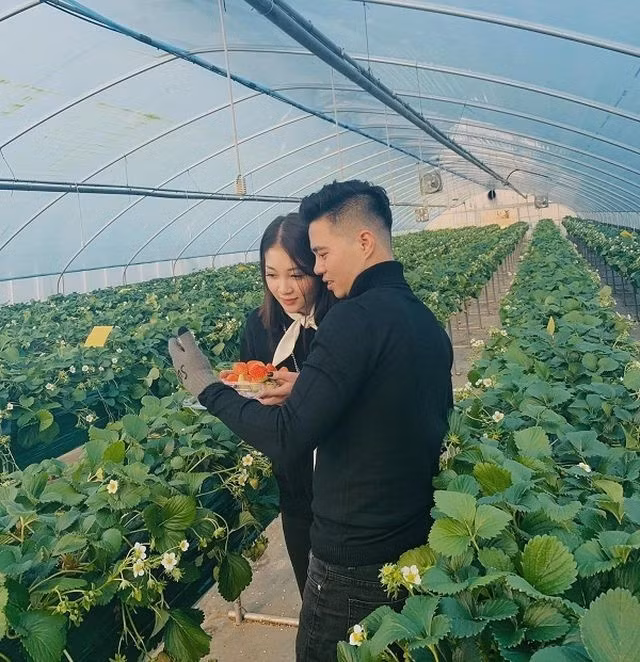 Vợ chồng cô dâu Nam Định chụp ảnh trong chuyến du lịch mới đây.