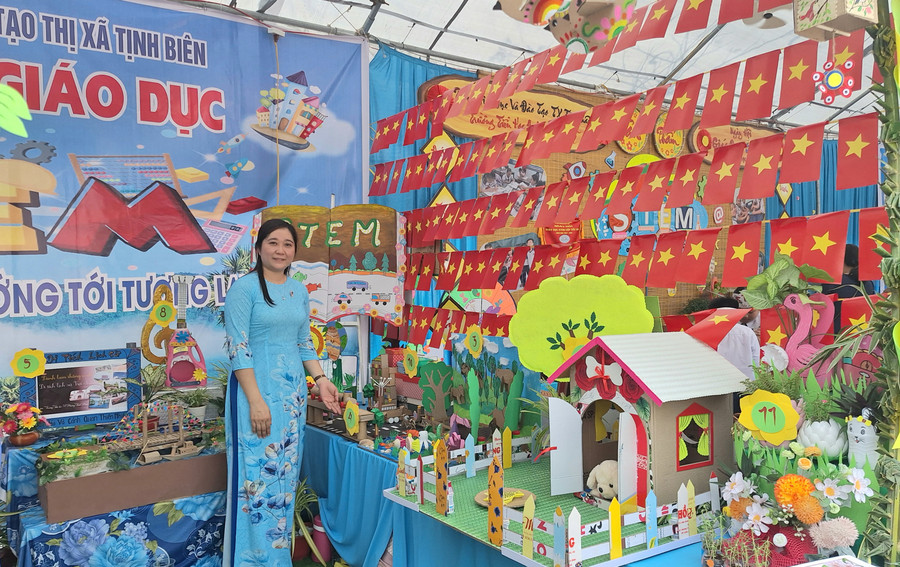 | Giáo viên tham gia gian hàng trưng bày sản phẩm STEM tại Ngày hội. |