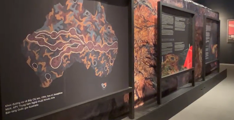 Triển lãm sắp đặt đa phương tiện “Bước qua một khúc đường ca” - “Walking Through a Songline” tại Bảo tàng Phụ nữ Việt Nam (Hà Nội) đang mở cửa đến 21/5, đón du khách tới để cùng “rong ruổi” đến… Australia.