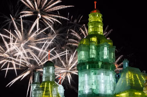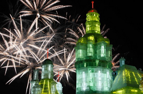 | Du khách đứng xem pháo hoa tại một tác phẩm chùa tháp bằng băng |