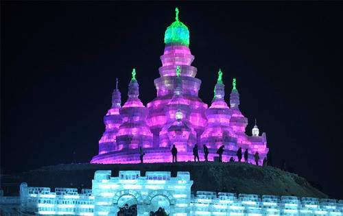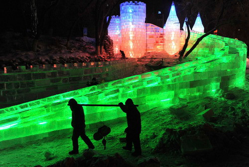 | Du khách lần lượt đi thăm các công trình làm từ băng tuyết |