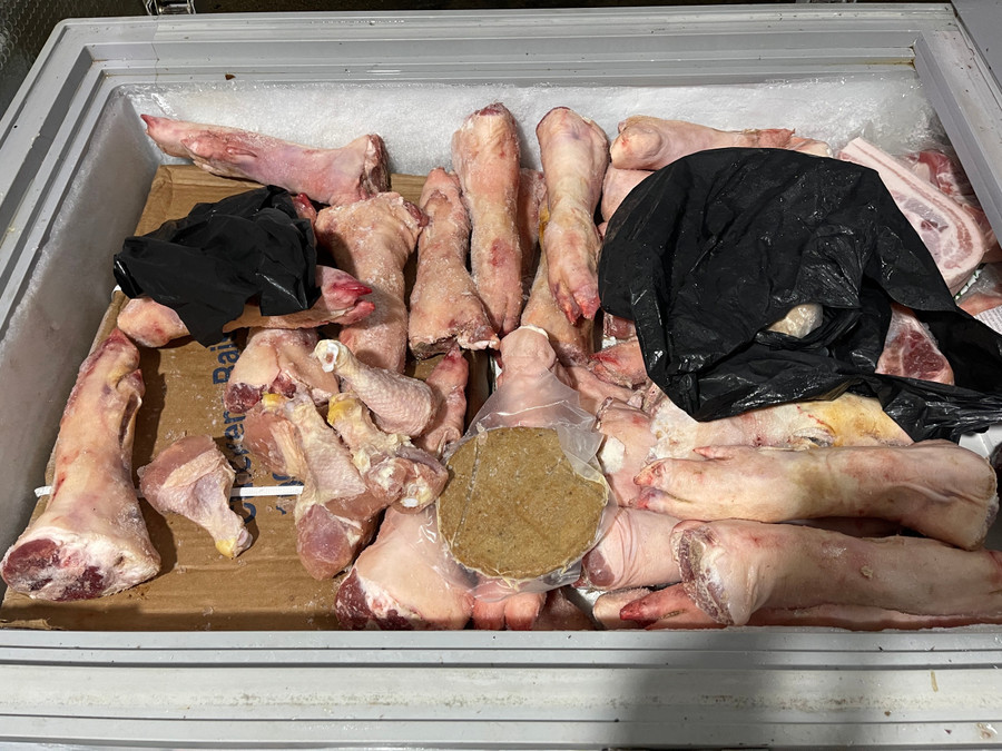 Qua kiểm tra, công an phát hiện tại kho hàng có lưu trữ hơn 1 tấn thực phẩm gồm: trứng gà non, giò heo, ba chỉ rút xương, xương cùi bò, bắp bò, bắp trâu, lõi bò… có dấu hiệu vi phạm.