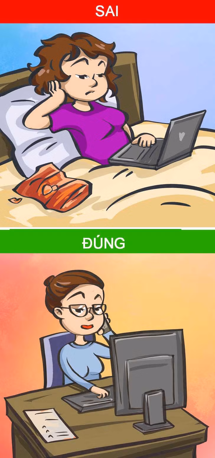 Việc thay đổi có thể khiến bạn thoải mái hơn khi làm việc ở nhà song điều này hoàn toàn không tốt nếu làm trong một thời gian dài. Bộ não của chúng ta liên hệ phòng ngủ với nơi nghỉ ngơi và khi ta chọn giường làm nơi làm việc, năng suất làm việc của bạn sẽ bị giảm và chất lượng giấc ngủ cũng không được đảm bảo.