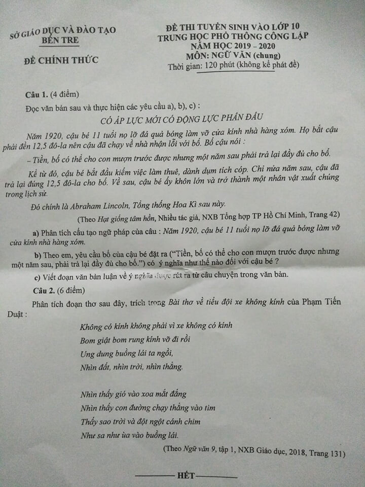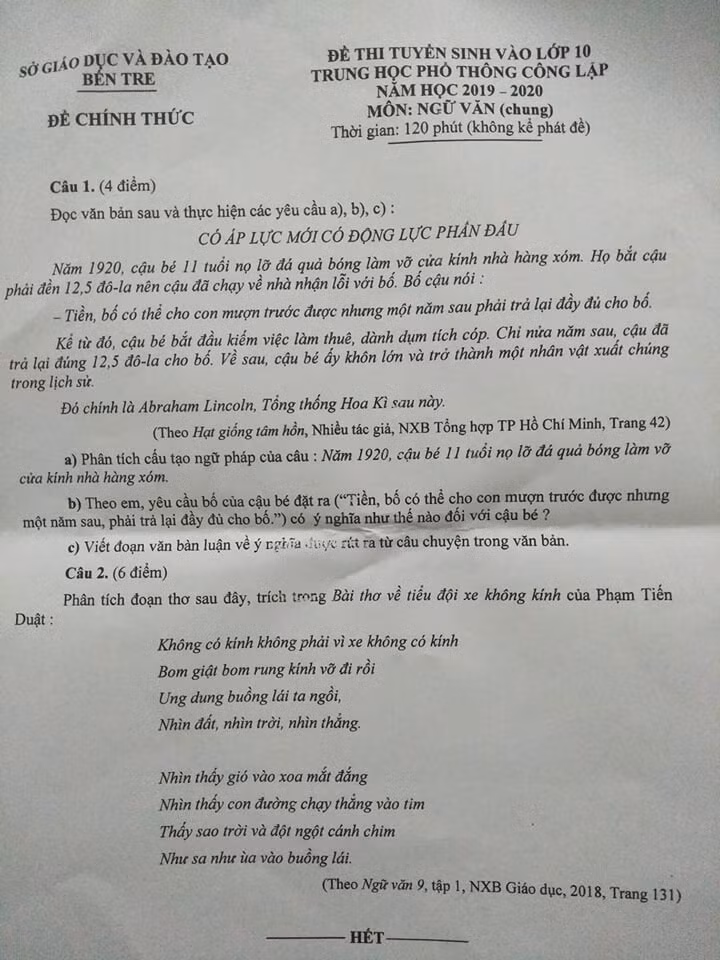 Ngày 1/6, tại tỉnh Bến Tre diễn ra kỳ thi tuyển sinh vào lớp 10 năm 2019. Tuy nhiên hết buổi thi đầu tiên của môn Ngữ Văn, nhiều giáo viên, học sinh đã hết sức bất ngờ khi ngữ liệu câu 1 của đề thi đề cập năm 1920 khi ấy Tổng thống Abraham Lincoln mới 11 tuổi. Trong khi thực tế vị Tổng thống Mỹ này đã bị ám sát mất năm 1865.