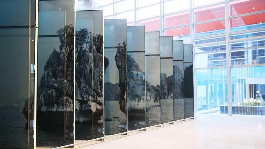 Bên trong khu vực nhà ga, có rất nhiều khu vực được décor bằng những bức bình phong kính hoặc vẽ hình ảnh Vịnh Hạ Long ngoạn mục. Những khoảng nghỉ mắt ngắm cảnh tuyệt vời này tạo cho hành khách cảm giác như lạc trong một không gian triển lãm sang trọng, hiện đại.