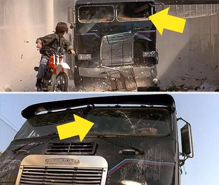 Cũng trong Terminator 2: Judgement Day, trong phân đoạn T-1000 rượt đuổi John Connor, khán giả dễ nhận thấy phần kính chắn trước cửa bánh lái bị rơi ra. Tuy nhiên, chỉ trong khoảnh khắc chuyển cảnh, chiếc kính được "phù phép" xuất hiện trở lại, chỉ bị nứt vỡ do va chạm.