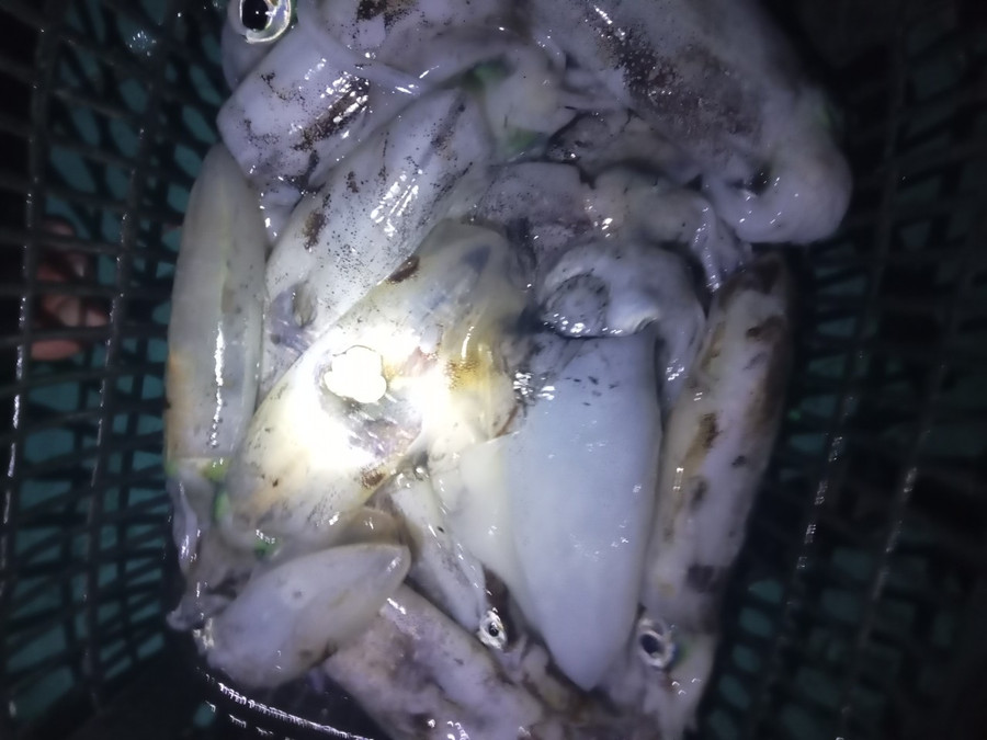 "Tôi theo nghề này lâu năm rồi nên ít khi đâm trượt. Động tác dùng xiên phải nhanh và dứt khoát. Đợt này đang mùa mực nên nhiều hôm cũng hay soi được mực lá loại 0,5kg/con. Nay trời có gió nên chủ yếu là loại mực nhỏ”, anh Dần nói.