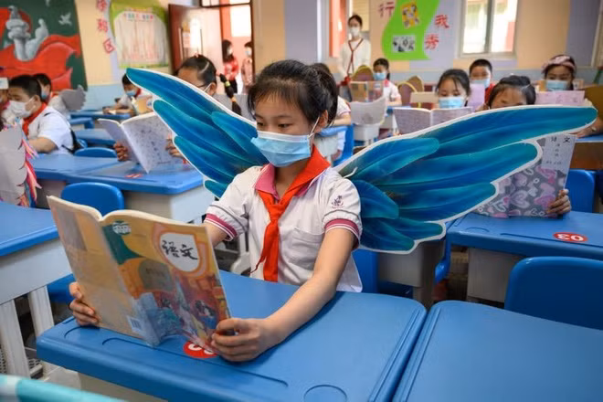 Trong ảnh, học sinh tại trường Tiểu học Ngoại ngữ ở quận Hạnh Hoa Lĩnh, thành phố Thái Nguyên, tỉnh Sơn Tây, miền Bắc Trung Quốc đang đeo những đôi cánh sặc sỡ đến lớp học.