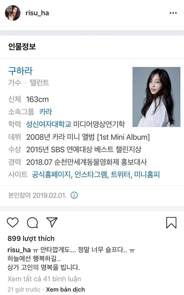 “Hara, vào lần đầu tôi nhận ra, bạn đã lo lắng cho tôi và bảo tôi gọi cho bạn nếu tôi gặp khó khăn. Bạn thật xinh đẹp và rạng rỡ, và tôi xin lỗi vì tôi không thể giúp đỡ bạn nhiều hơn. Tôi rất tiếc. Tôi nên giúp bạn dù chỉ một chút. Tôi tức giận và ghét thế giới này, nhưng tôi hy vọng bạn hạnh phúc ở đó. Rất xin lỗi và cảm ơn”.