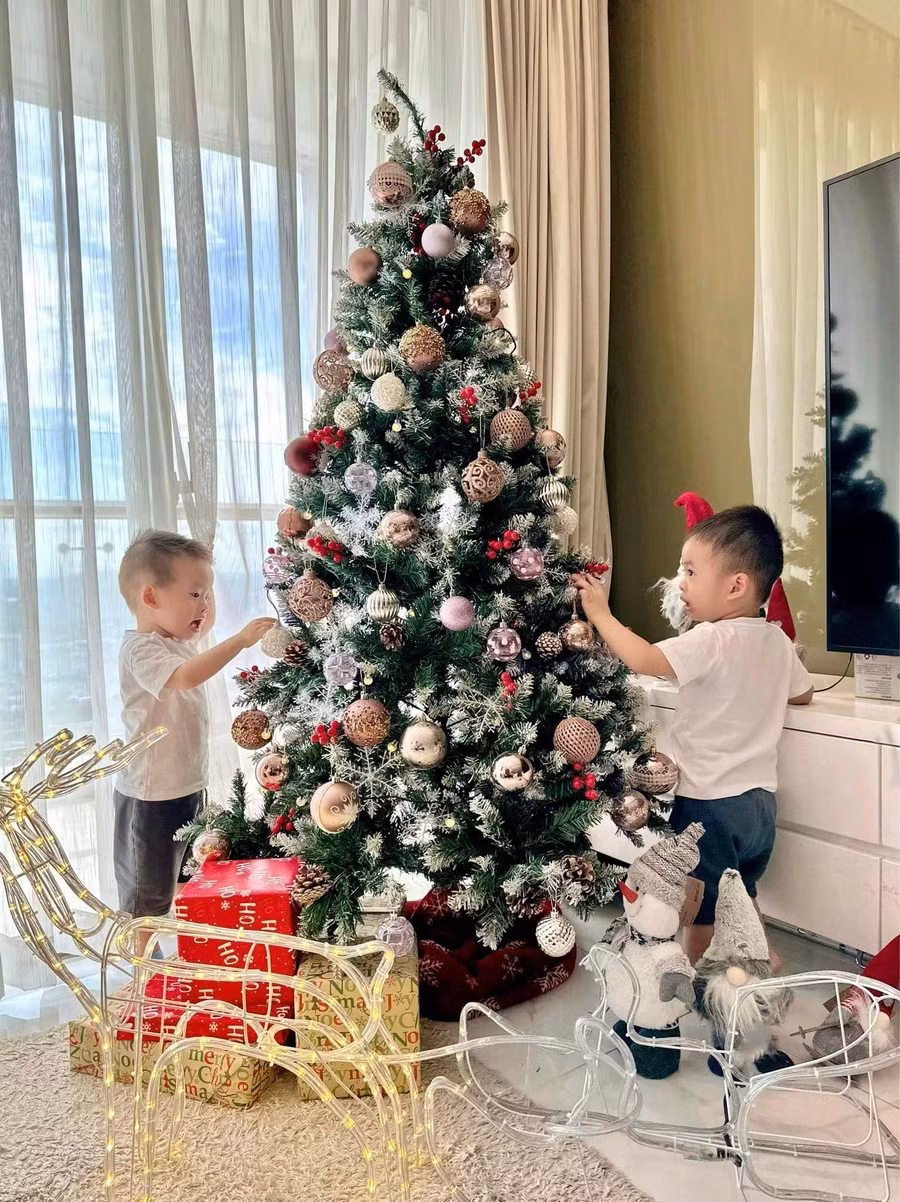 | Gia đình Hồ Ngọc Hà cũng đã trang trí xong cây thông Noel. Hai nhóc tì của nữ ca sĩ đã tỏ ra rất thích thú với cây thông này. |
