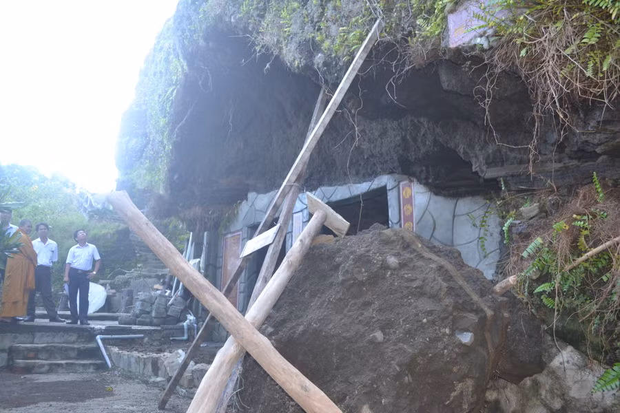 Sư cô Minh Thùy – Chủ trì Chùa Đục cho biết: Mưa liên tục nhiều ngày khiến cho vách đá bị ngấm nước ảnh hưởng đến kết cấu và đổ sập ngay trước cửa chùa, rất may sự cố sạt lở xảy ra vào ban đêm nên không có thiệt hại về người,