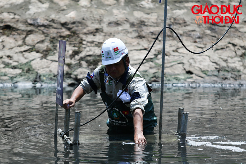 | Ông TS. Kubo Jun ( Cố vấn kỹ thuật Tổ chức xúc tiến thương mại- môi trường Nhật Bản, Chuyên gia công nghệ máy sục khí công nghệ nano JVE) trực tiếp lội xuống lòng sông để kiểm tra thiết bị |