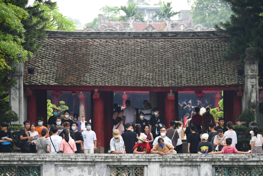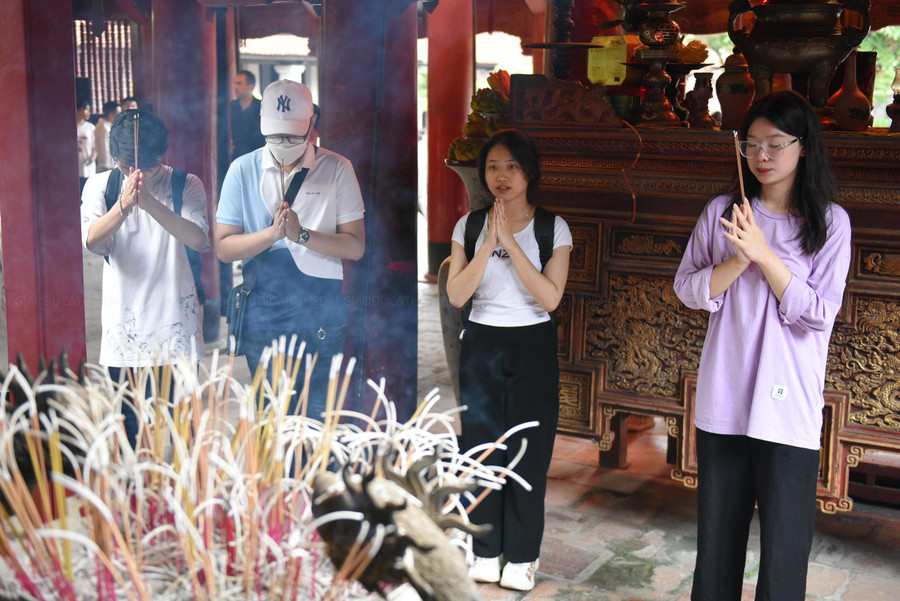Ghi nhận tại Văn Miếu- Quốc Tử Giám rất đông sĩ tử đã đến để dâng lễ, thắp hương, cầu may mắn trong ngày hôm nay.