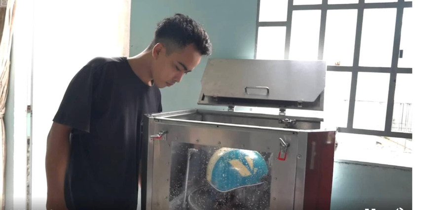 “Máy giặt nón (mũ) bảo hiểm tự động” là sản phẩm của nhóm sinh viên gồm Lê Tiếng Đạt, Bình Trịnh Thắng, Sơn Xê Rây Oáte, sinh viên Khoa Cơ khí Chế tạo máy, Trường Đại học Sư phạm Kỹ thuật TPHCM.