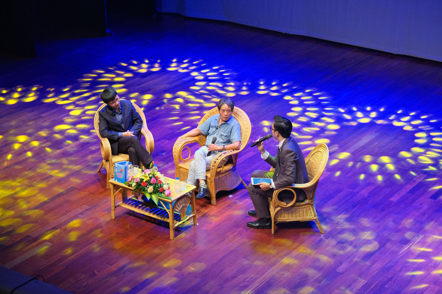 | Nhà báo Vũ Huyến với những câu chuyện về đời, về nghề tại tọa đàm. |