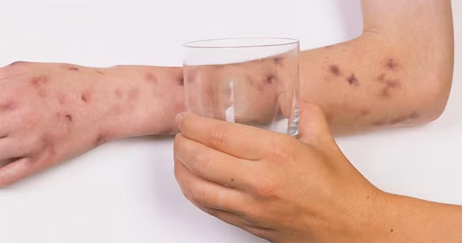 Tiếp đó, da sẽ xuất hiện những vết ban. Vì đây là một triệu chứng rất phổ biến nên nhiều người nhầm lẫn với sốt xuất huyết hoặc sốt virus. Để kiểm tra xem vết phát ban có phải là do viêm màng não hay không rất đơn giản.