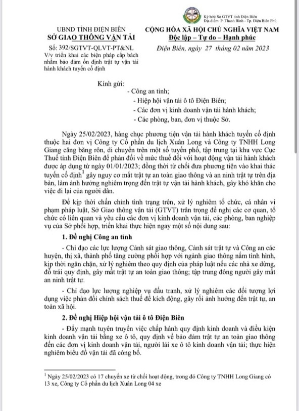 Ngày 27/2, Sở GTVT tỉnh Điện Biên đã phát đi văn bản về việc triển khai biện pháp cấp bách đảm bảo trật tự ổn định hoạt động vận tải hành khách tuyến cố định.