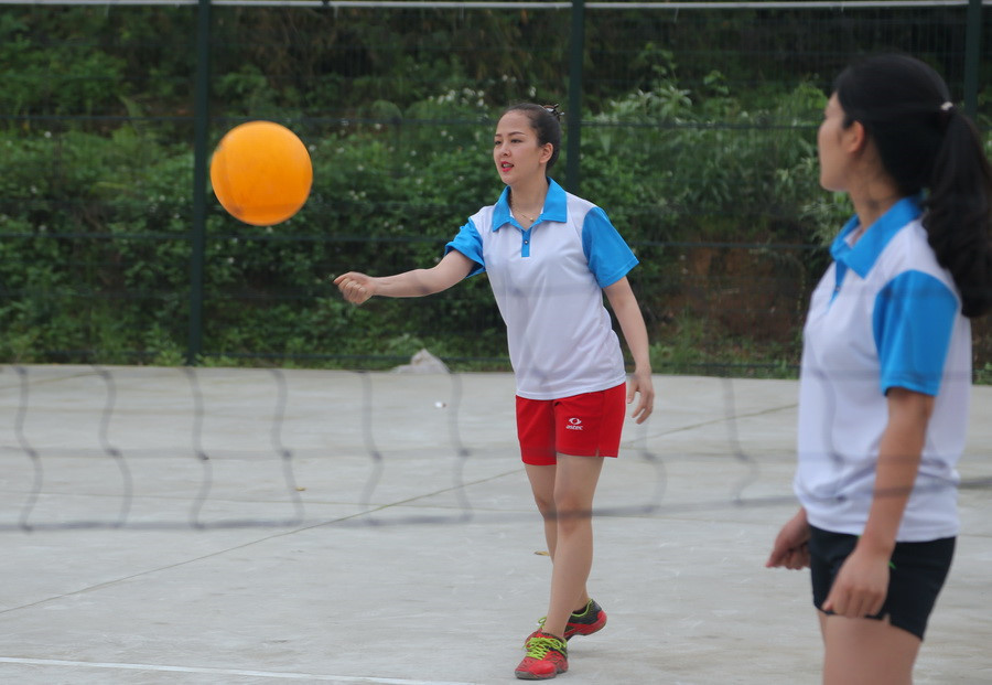 Một nữ cầu thủ của Đội Khoa Quốc tế đang phát bóng lên trong trận gặp Đội Liên quân các Trung tâm trực thuộc ĐHTN