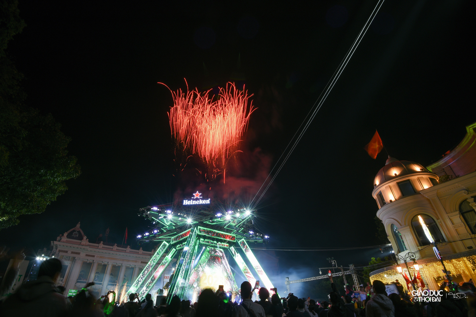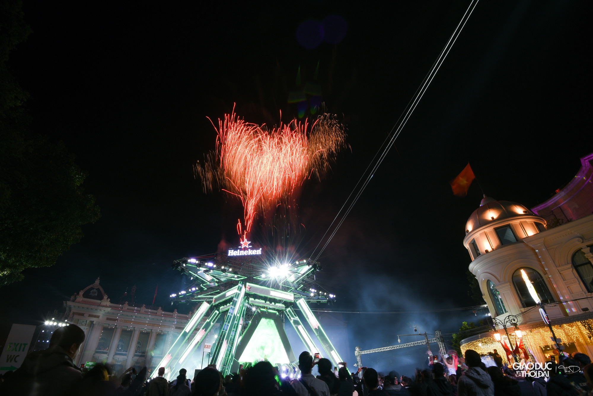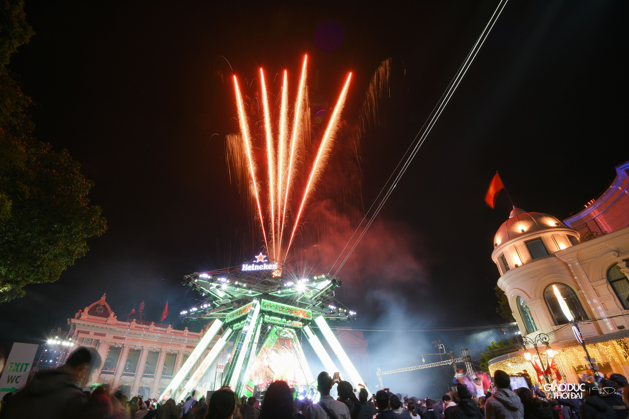 Tại Quảng trường Cách mạng tháng 8, trước cửa khu vực Nhà hát lớn TP. Hà Nội, không khí tại đây rất sôi động, âm thanh, ánh sáng hoành tráng. Các bạn trẻ đã có mặt từ rất sớm để tham gia lễ hội.
