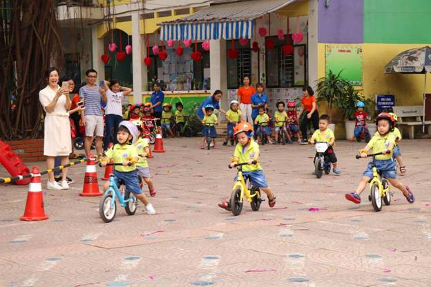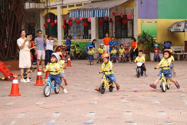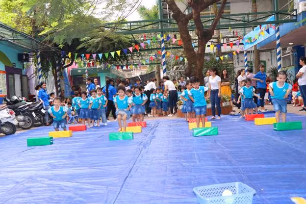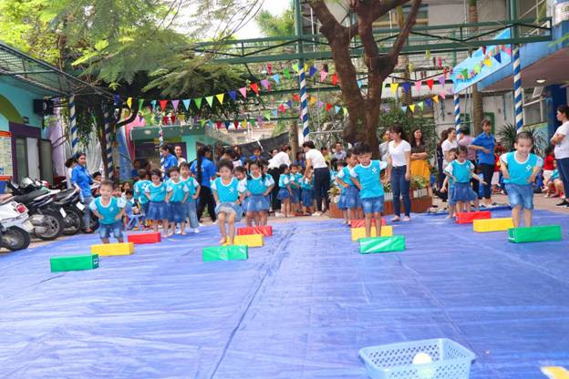 Theo đó, Hội khỏe măng non gồm 2 phần là: Phần đồng diễn thể dục của các khối ( Nhà trẻ, MG Bé, MG Nhỡ, MG Lớn ); Bé vui vận động với các trò chơi như : Bóng đá, nhảy sạp, bật qua vật cản ném bowling, chuyền bóng qua đầu qua chân, đua xe thăng bằng, quả bóng vui nhộn....