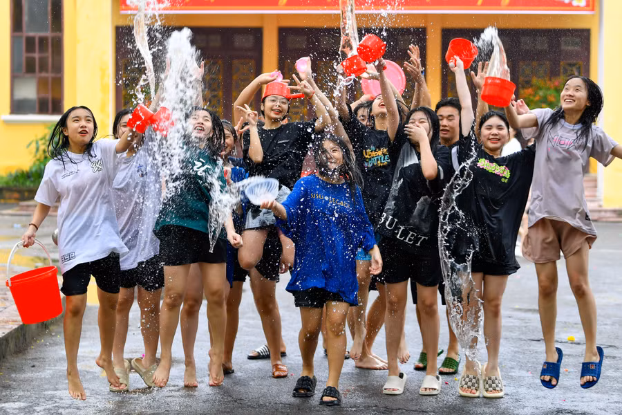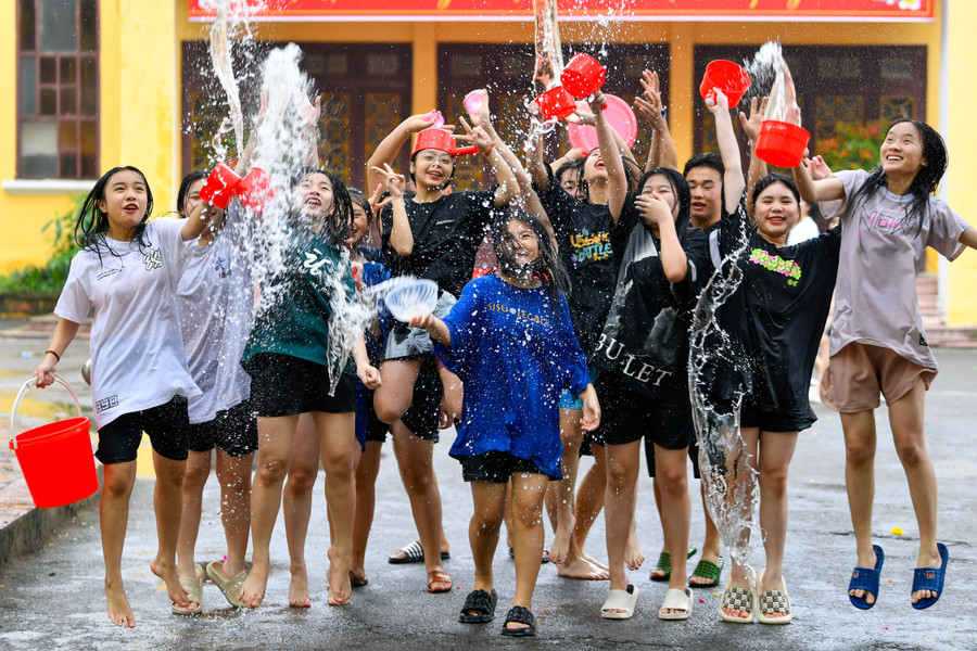 | Ngay sau phần lễ hàng trăm học sinh Việt Nam, Lào cùng tham gia lễ hội té nước. |