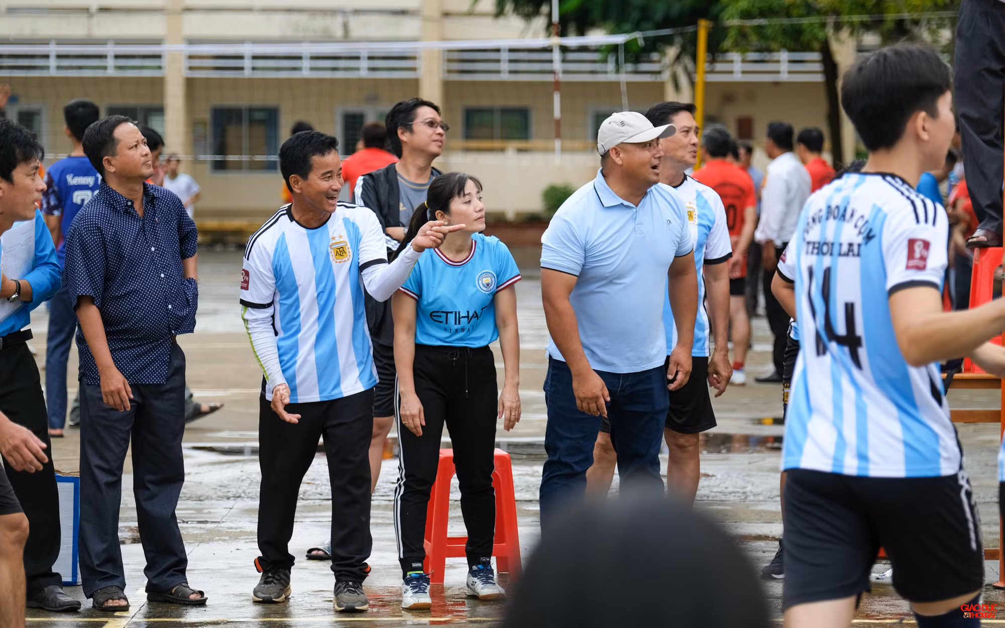 | Hội thao diễn ra trong thời tiết mưa, thầy cô giáo hỗ trợ quét nước sân bóng cho các đội bóng. |