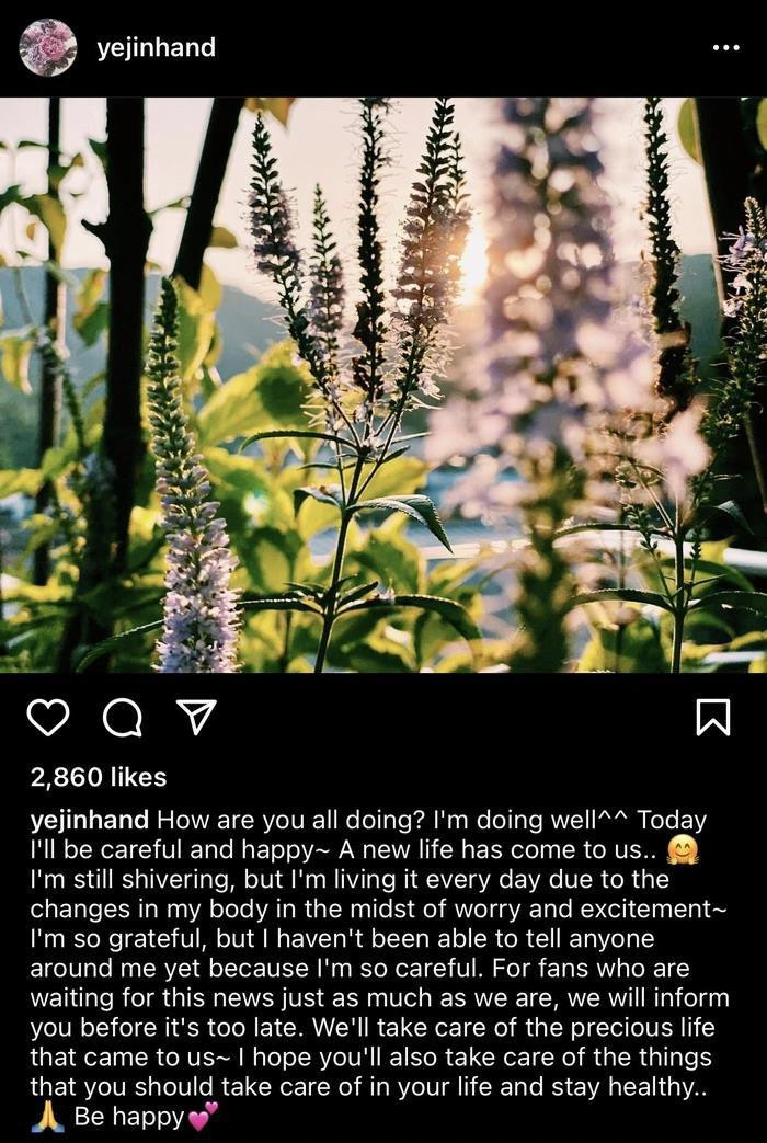 Hẳn là không giấu được niềm hạnh phúc bất tận, Son Ye Jin ngọt ngào bày tỏ rằng: "Hôm nay mình sẽ thông báo với mọi người một tin tức hạnh phúc. Một sinh mệnh mới đã đến với chúng mình. Mặc dù vẫn còn lúng túng nhưng mình vẫn cảm nhận được sự thay đổi của cơ thể trong sự lo lắng và hồi hộp mỗi ngày. Mình thật sự rất biết ơn các bạn, nhưng mình đã rất cẩn thận nên mình không thể nói với những người xung quanh.
