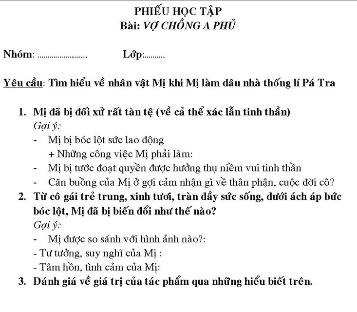 Ví dụ, khi dạy bài Vợ chồng A Phủ, Ngữ văn 12, tiết 55, để hướng dẫn HS tìm hiểu sức sống tiềm tàng và khát vọng hạnh phúc của nhân vật Mị, GV có thể cho các nhóm HS hoàn thành PHT sau trong khoảng 10 phút.