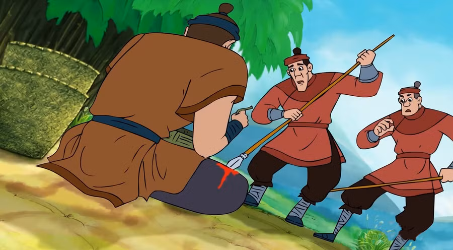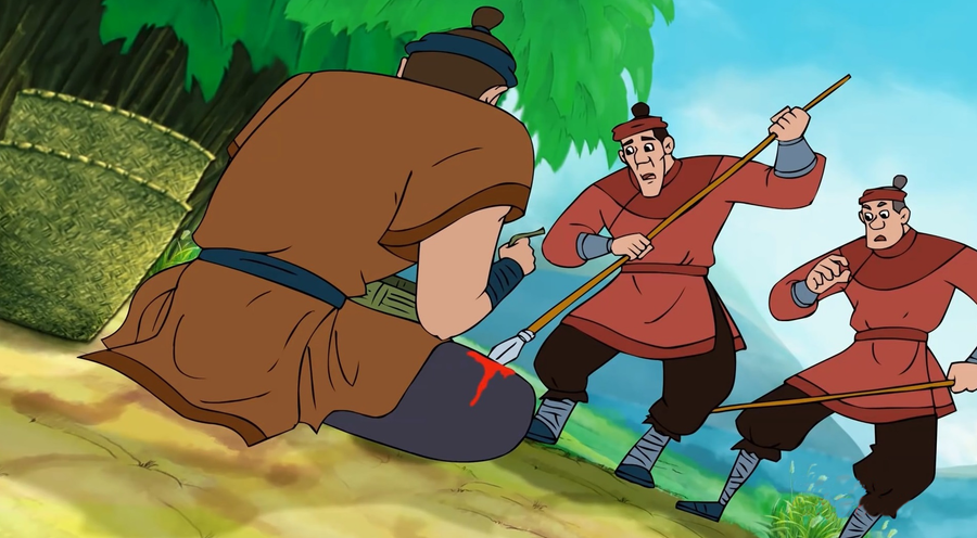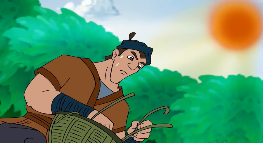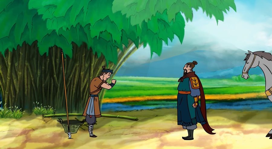 Giữa lúc ấy, đoàn quân đưa kiệu Trần Hưng Đạo đi ngang qua làng. Lối hẹp, quân đông võng xe chật đường, loa phát thanh náo nhiệt. Thế nhưng, chàng trai vẫn ngồi điềm nhiên đan sọt. Quân mở đường giận quá bèn lấy giáo đâm vào đùi chàng trai, máu chảy lai láng nhưng chàng trai vẫn không hay biết.