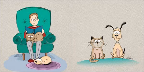 Chúng ta đều biết rằng mèo rất kiêu ngạo và lười biếng, và chó thì rất vui tươi và không thể kìm nén tình cảm. Tính cách vốn có của chúng là như vậy, và chúng ta yêu thương chúng theo cách riêng của mình. Mời các bạn xem bộ tranh đáng yêu của nghệ sĩ Bird Born minh họa cho 2 cá tính khác biệt này của chó và mèo: