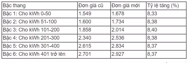Đối với giá bán lẻ điện sinh hoạt, biểu giá điện khi đó vẫn chia thành 6 bậc. Bậc thấp nhất là 0-50 “số điện”, bậc cao nhất là từ 401 “số điện” trở lên. Bậc cao nhất có giá gần gấp đôi bậc thấp nhất.