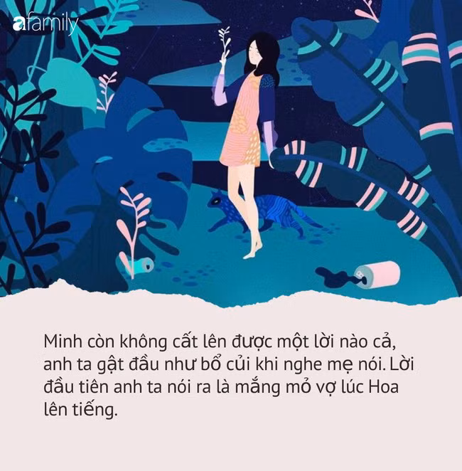 Thậm chí, Minh còn không cất lên được một lời nào cả, anh ta gật đầu như bổ củi khi nghe mẹ nói. Lời đầu tiên anh ta nói ra là mắng mỏ vợ lúc Hoa xin có ý kiến. Cô không muốn sống chung với nhà chồng, đấy còn chưa kể nhà này do bố mẹ cô mua, đứng tên cô.
