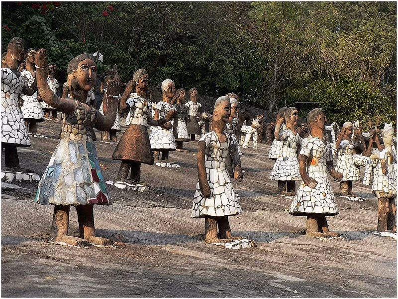 Nek Chand làm việc ban đêm bởi vì ông sợ bị mọi người phát hiện. Trong vòng 18 năm liền, ông giữ bí mật nơi làm việc này. Vào thời điểm bị phát hiện, ông đã phát triển một khu liên hợp gồm các sân liền nhau rộng 48.000m2, mỗi sân chứa đầy hàng trăm tượng điêu khắc bằng bê tông phủ gốm bên ngoài, hình các vũ nữ, nhạc công và loài vật.