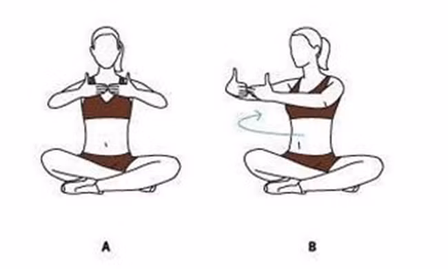 Ngồi xếp chân, úp 2 tay trước ngực như hình minh họa, vặn người sang trái rồi vặn người sang phải, thực hiện 20 lần.