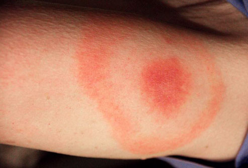Đặc trưng của bệnh Lyme là ban đỏ hình bia xuất hiện 1 - 2 tuần sau khi bị ve đốt, mặc dù không phải ai cũng sẽ xuất hiện ban đỏ đặc biệt này. Ban đỏ có thể đi kèm với sốt, rét run và đau nhức cơ thể.